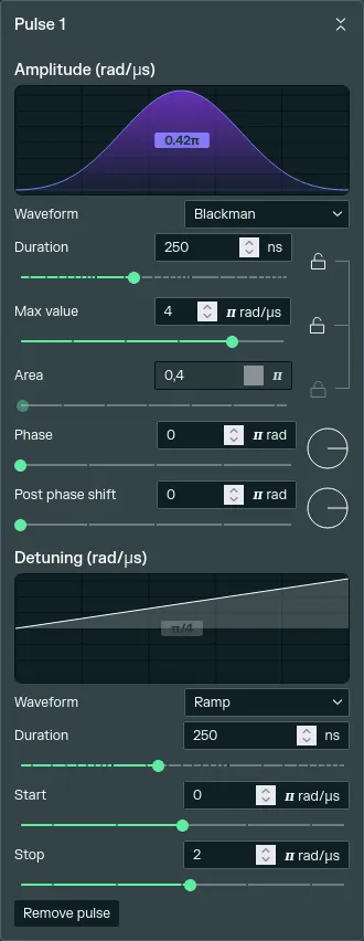 When creating a new pulse, default values will be assigned, that you can fine-tune in the Pulse panel of the right sidebar, until you get the pulse necessary for your problem.