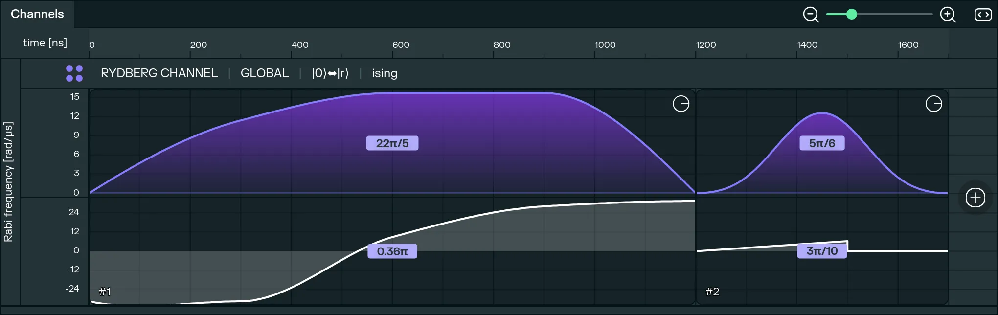 In Pulser Studio, pulses are managed on the Channels panel. It offers a timeline view of the sequence of pulses, as they will be executed by the device, and a visualization of the main characteristics of each pulse, such as waveform, amplitude, phase and detuning.